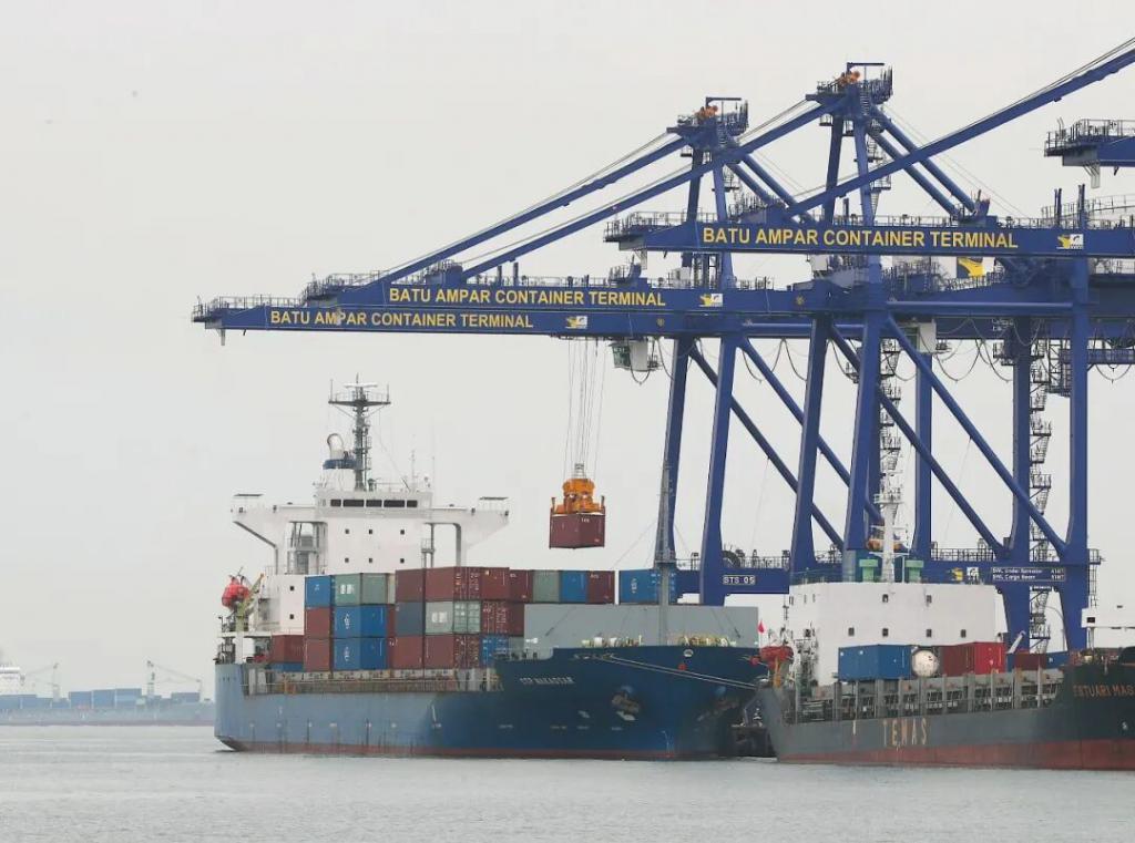 2025 年 8 月 21 日在印度尼西亚巴淡岛港拍摄的中远海运集团新开辟的巴淡岛港至中国海南洋浦港直航航线的首航集装箱货轮 / 新华社记者 岑云鹏 摄