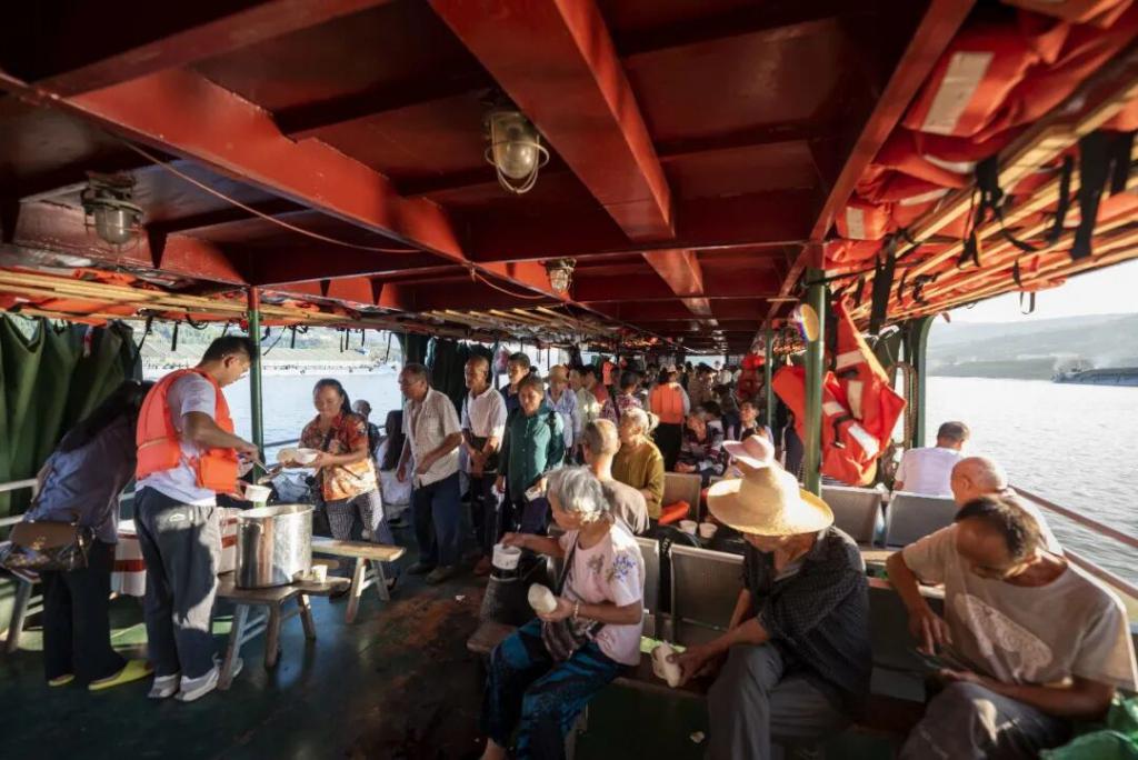2024 年 9 月 15 日,菜农们在客轮上领取免费餐。李鑫摄
