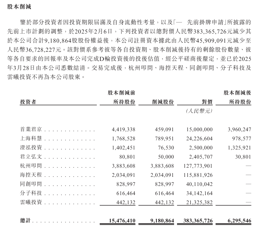 然而,绿云软件的IPO之路不是一帆风顺。诉讼阴影未散之际,部分资本选择提前离场。招股书显示,于2025年2月6日起,部分投资者总计削减3.83亿元,合计削减9,180,864股股份权益。杭州叩问、海控天程、同创叩问、分子科技即云曦投资不再为股东。