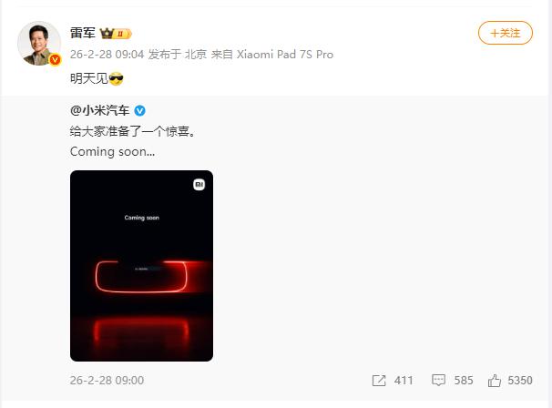 据悉,小米汽车官方微博当天发文称," 给大家准备了一个惊喜 "。小米创始人、董事长兼 CEO 雷军转发该条微博并配文 " 明天见 "。
