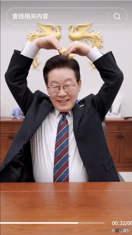 身着深色西装外套、白衬衫,搭配红蓝条纹领带,面带笑容,双手举至头顶,比出三个标准的爱心手势,这是韩国总统李在明在 TikTok 平台上的首秀。