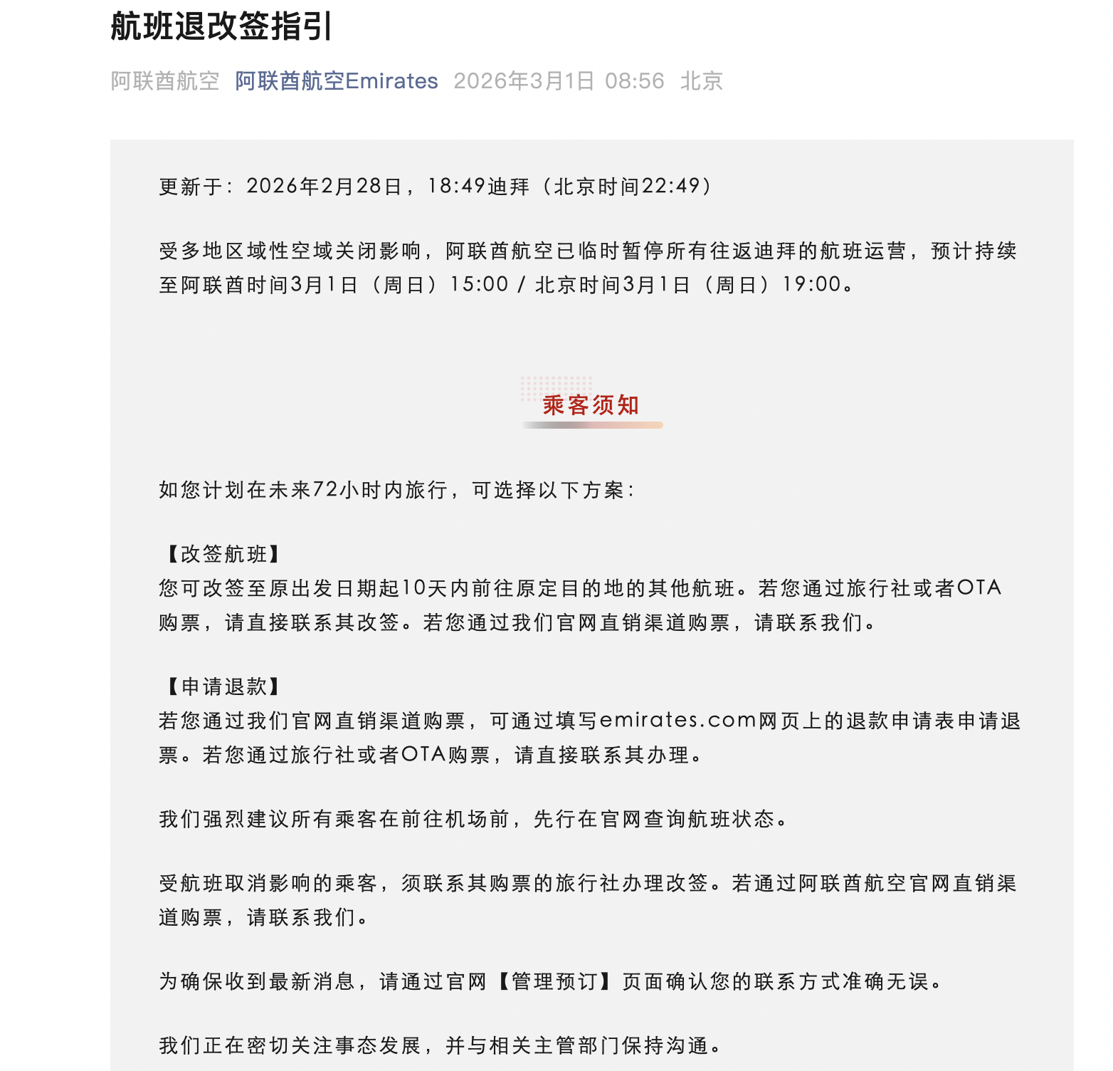 阿联酋航空称,计划在未来72小时内旅行的旅客,可改签至原出发日期起10天内前往原定目的地的其他航班,也可以申请退款。