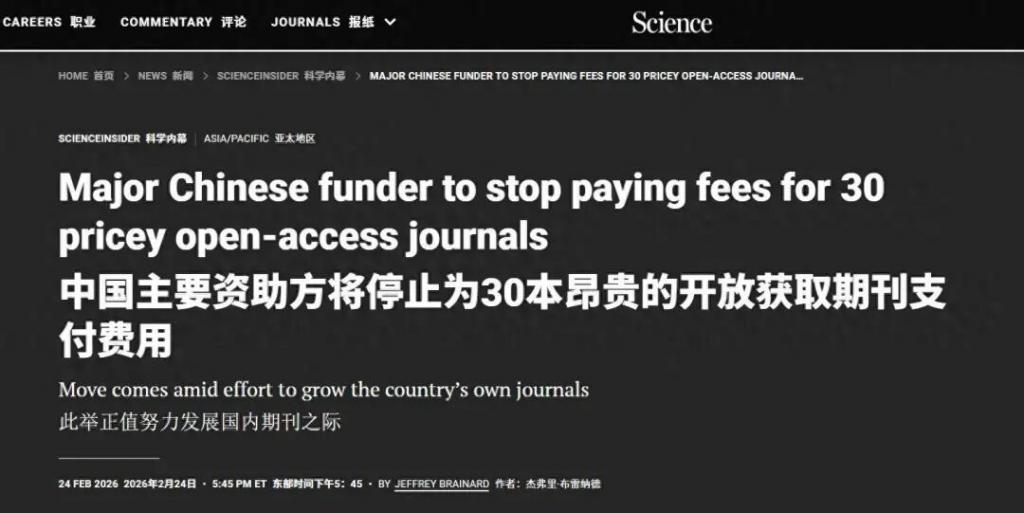 这场持续多年的 " 付费发表 " 游戏,终于有人掀桌子了!从 2026 年 3 月 1 日起,中科院将停止使用院内经费和中央财政拨款,去支付大约 30 到 33 种国际高价 " 开放获取 "(OA)期刊的发表费,其中不乏《科学进展》、《自然通讯》这类顶流 OA 期刊。