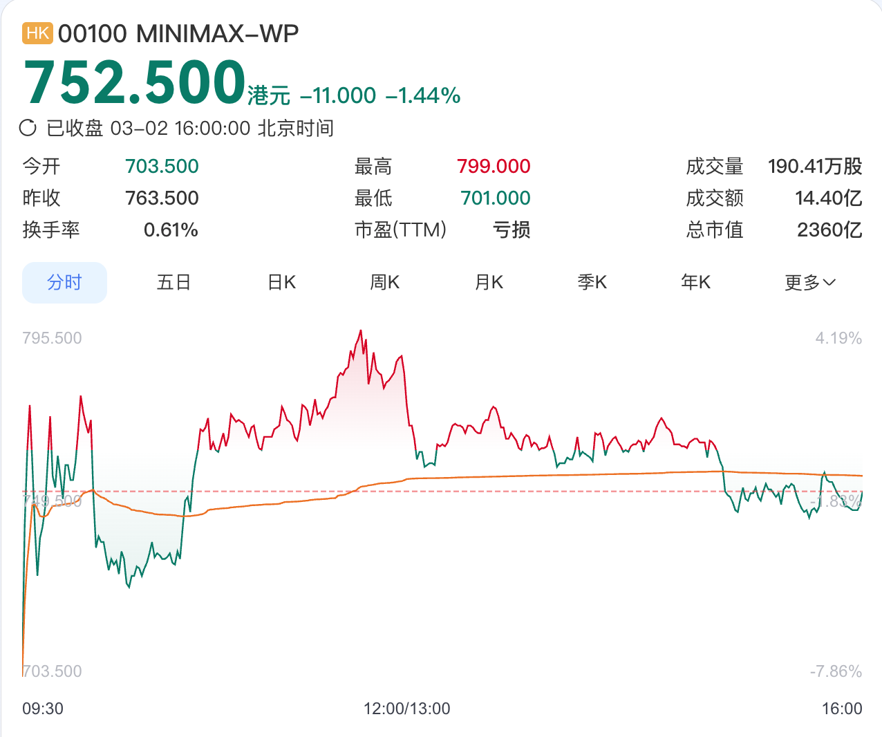 今年1月9日,MiniMax正式在港交所主板挂牌上市,上市首日开盘涨42%,报235.4港元/股,市值约719亿港元,随后不到两个月里股价一路攀升。截至3月2日收盘,MINIMAX港股股价报752.5港元/股,总市值2360亿港元。