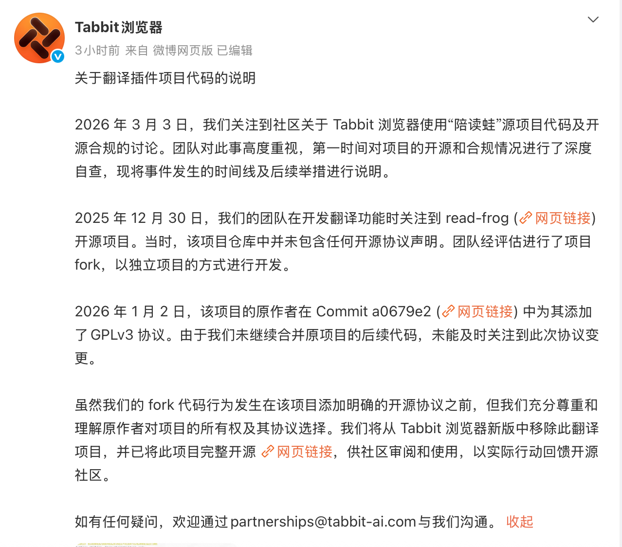 声明称,Tabbit团队在开发翻译插件功能时,使用并修改了开源项目read frog的代码。过程中对于该项目的开源协议调研不够充分,对开源社区规范造成了不好的影响。“我们虚心改正,并第一时间开源了相关的代码。”