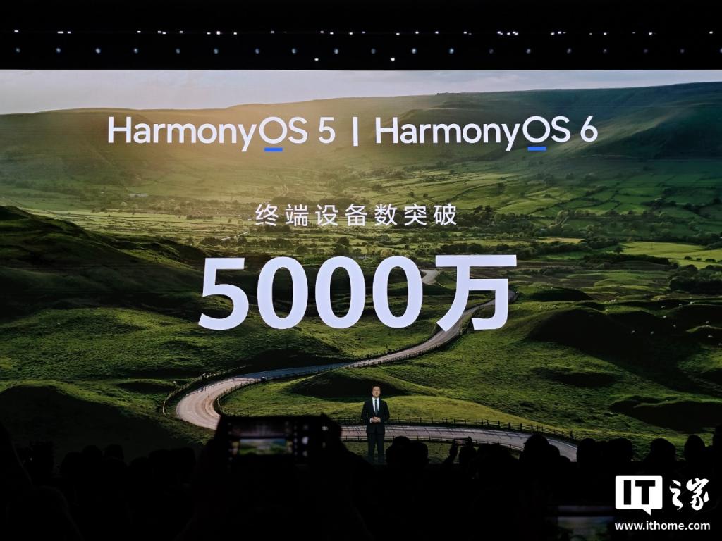 据 IT 之家早些时候报道,华为鸿蒙 HarmonyOS 5 / HarmonyOS 6 终端设备数突破 5000 万。HarmonyOS 系统日均新增设备数突破 15 万,可获取应用、服务突破 35 万,注册开发者超过 1000 万。
