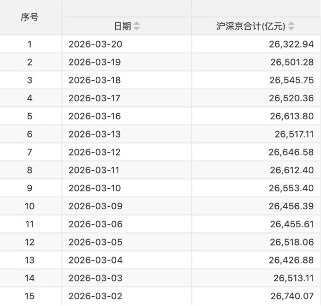 截至有最新数据可查的3月20日,沪深京三市融资融券余额合计26322.94亿元,较前一交易日减少178.34亿元;融资余额合计26148.43亿元,较前一交易日减少174.08亿元;融券余额合计174.51亿元,较前一交易日减少4.26亿元。