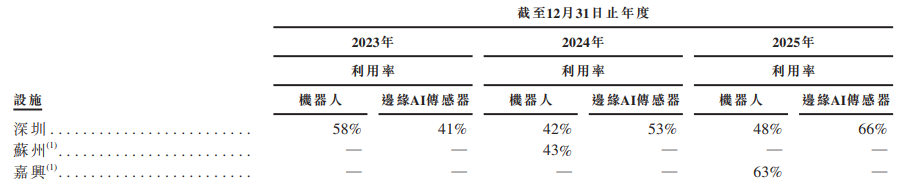 另据招股书,思谋科技的产能利用率不算高,2025年其深圳工厂机器人、边缘AI传感器等产品的产能利用率分别是48%、63%,嘉兴工厂的机器人产能利用率为63%。