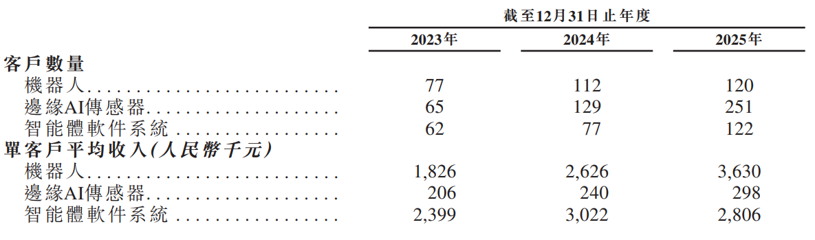 - 2023年到2025年,思谋科技用于智能检测和操作任务的机器人产品单价分别是182.6万元、262.6万元、363万元,客户量从77家增至120家,相关收入从1.41亿元增至2.94亿元、4.36亿元;