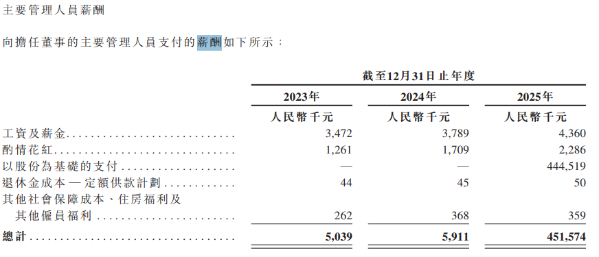 2025年,思谋科技向担任董事的主要管理人员支付的薪酬高达4.52亿元,其中以股份为基础的支付达4.45亿元。公司三位联合创始人(董事)的薪酬过亿,其首席技术官吕江波、技术负责人刘枢、产品总裁李睿宇的薪酬分别为1.04亿元、1.38亿元、1.63亿元,合计超过4亿元。