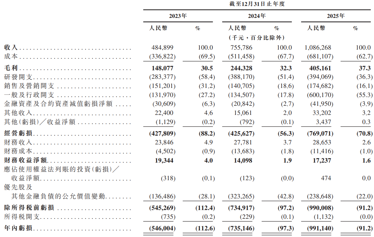 其中,2023年至2025年,思谋科技的经营开支居高不下,分别是5.67亿元、6.63亿元、11.69亿元,占当年收入比重分别是116.91%、87.7%、107.64%。其中: