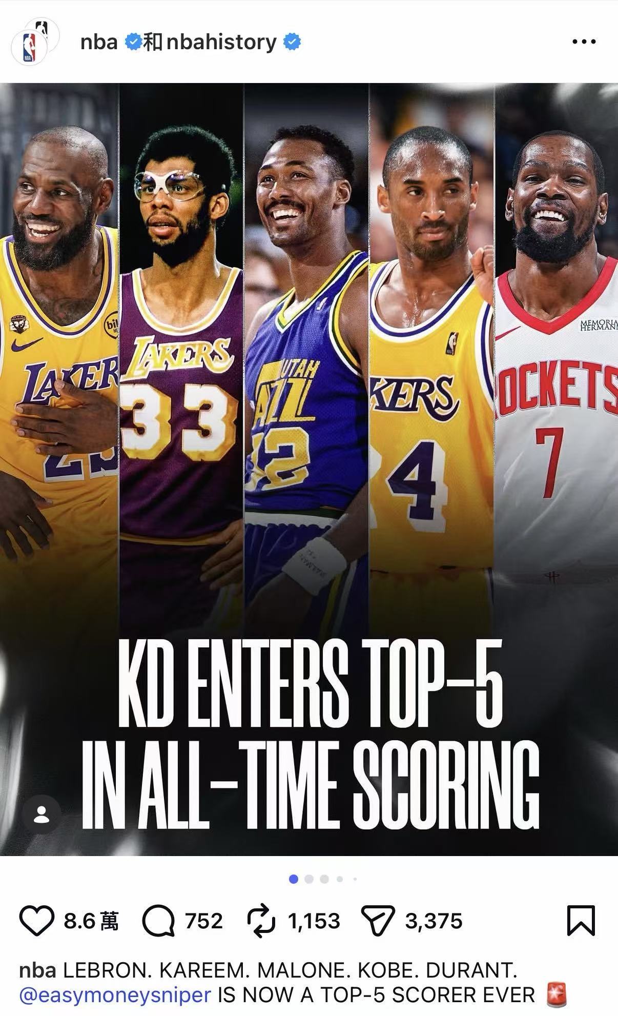 杜兰特生涯总得分超越乔丹,成为历史第五/图片来源:NBA Instagram