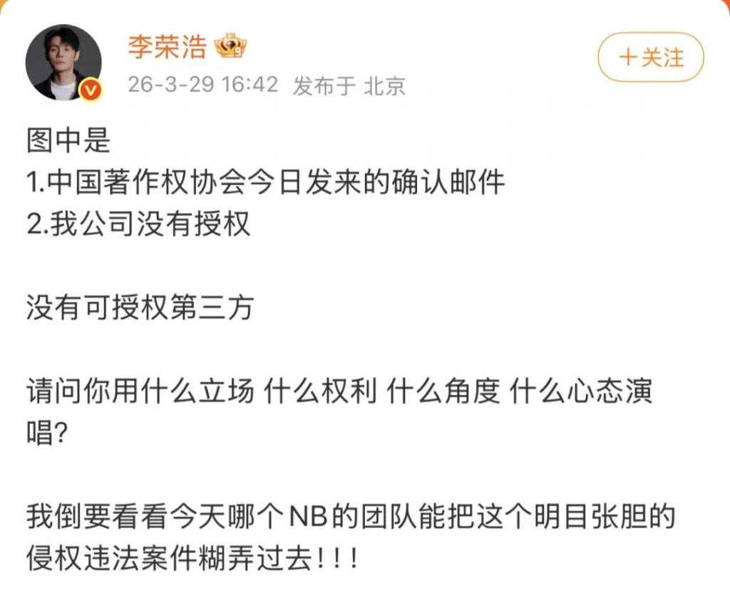 单依纯隔空道歉后,李荣浩再发文四连问,晒出音著协确认邮件