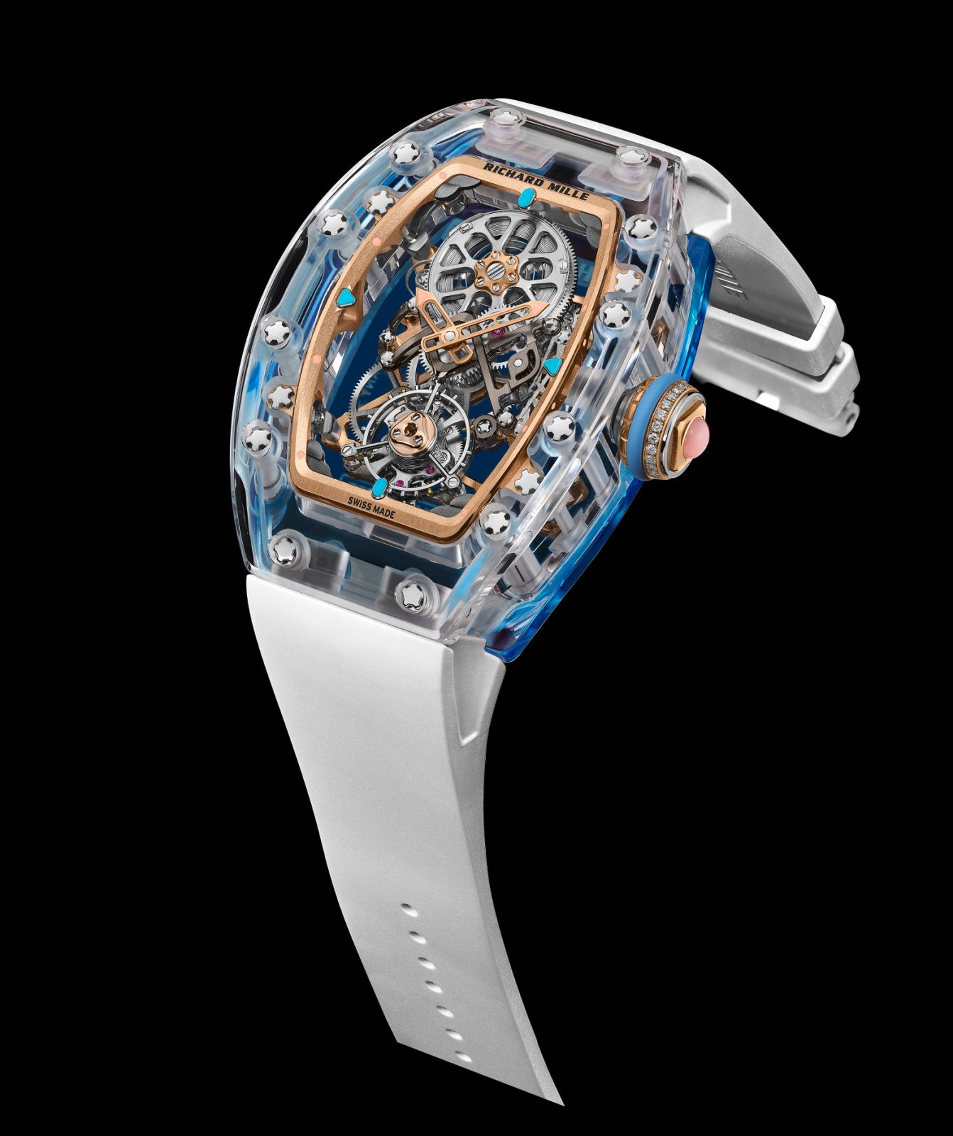 同年推出的RM 75-01浮动陀飞轮蓝宝石水晶腕表同样能体现理查米尔对极致工艺的追求。该新作的浮动陀飞轮机芯专为蓝宝石表壳设计,搭配蔚蓝色或者淡紫色蓝宝石水晶底盖展现通透之美。