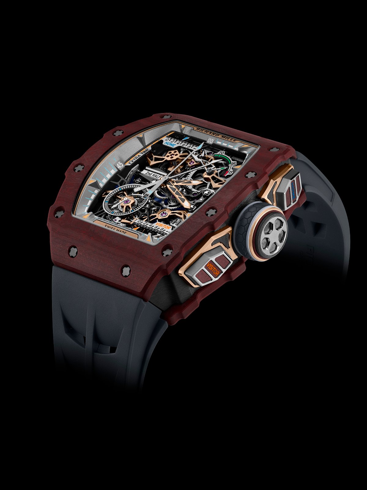 RM 41-01腕表搭载的第二项复杂功能为“机械进球计数器”。用户通过位于2点钟与4点钟位置的按钮,可分别记录主队与客队的进球数。每次按压,指针便通过专属齿轮系统沿金属轨道推进,最多可记录9粒进球,随后自动归零。