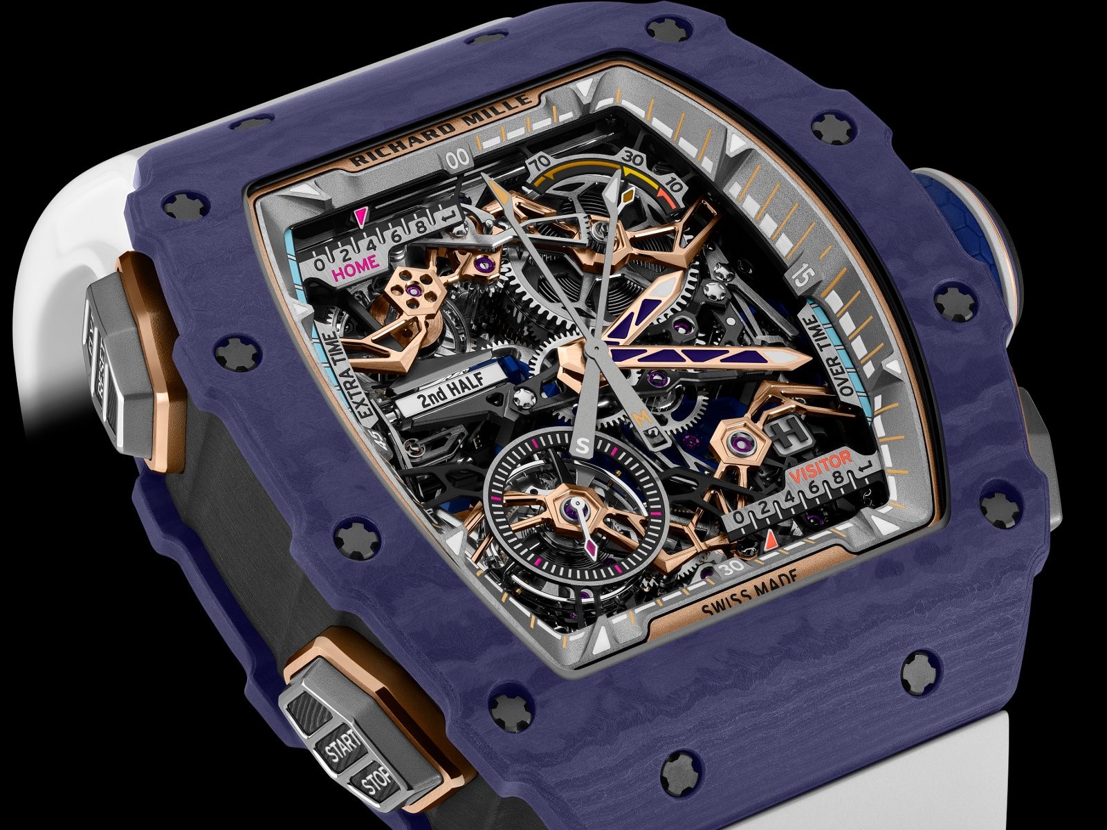 该腕表9点钟位置的“赛事阶段指示器”复杂功能为理查米尔首创,用于实时显示足球比赛的实时赛事阶段。用户每次重置飞返计时功能,显示会从上半场推进至下半场,随后进入加时赛的上下半场。此外,相对应的表盘4点钟位置还搭载了标志性的功能指示器——漆面背景上的三块钛合金片显示当前处于上链、空档或手动调时状态。