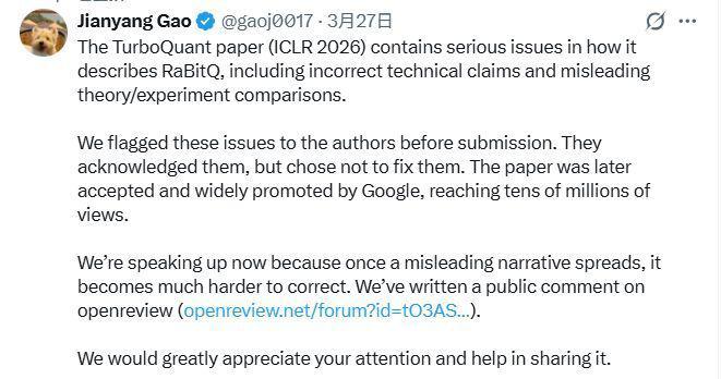 高健扬还表示,谷歌 TurboQuant 团队 " 知错不改 "。谷歌论文 2025 年 4 月正式发表前,自己就已通过邮件指出了上述问题,但谷歌方面在知情后仍未在最终版本中进行彻底修正。