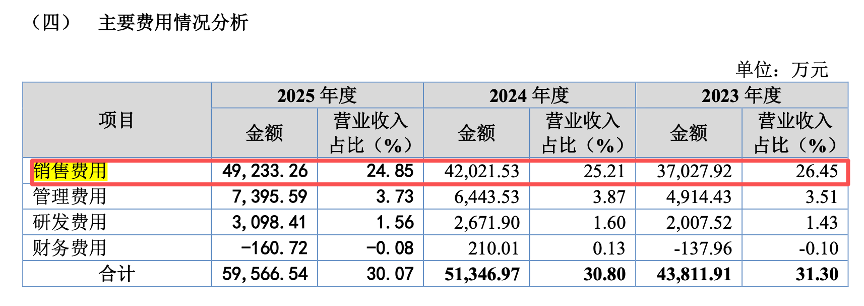 具体来看,千岸科技2025年销售费用合计4.92亿元,较2024年的4.20亿元和2023年的3.70亿元继续上行,其中销售平台费用2.61亿元,占比53.07%,市场推广费1.24亿元,占比25.22%,两项合计3.85亿元,占销售费用总额的78.29%。这意味着,公司每花出去100元销售费用,有78元直接投向平台抽佣、站内流量和推广采买。