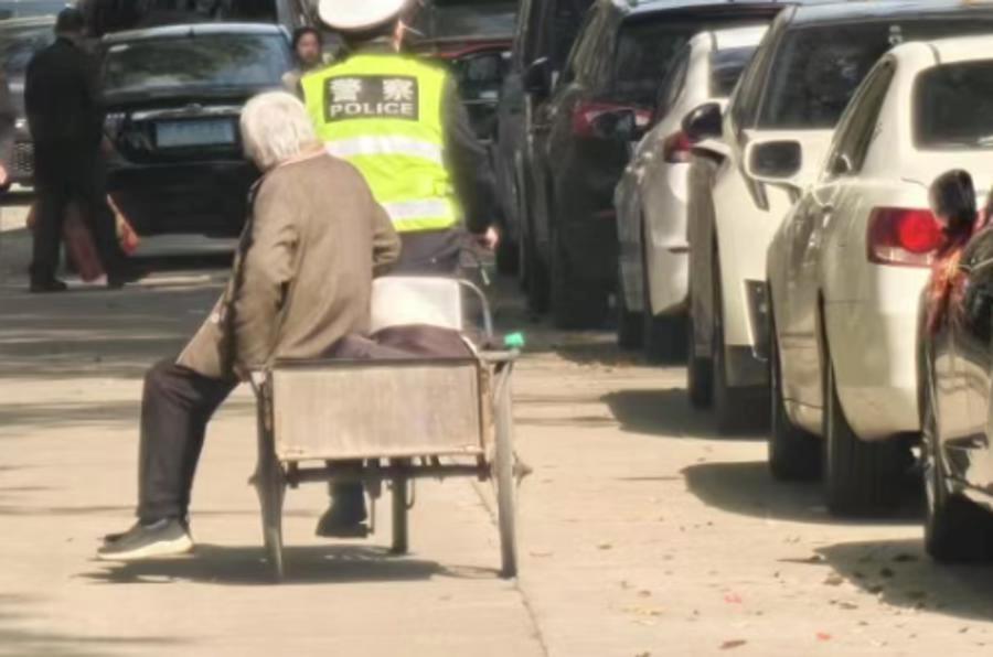 3 月 28 日 10 时许,在常州经开区横山桥福寿庵附近路段,正在清明祭扫安保执勤的辅警胡文崔,发现一位白发老奶奶正推着小三轮艰难前行。老奶奶佝偻着背,步履蹒跚,三轮车里放着几包祭品,显然是到山上的墓园祭拜的。" 这里距离最近的墓园还有一公里,上山的路开始爬升,老奶奶显然体力不支,推着三轮车走得格外吃力。" 胡文崔立即上前询问,得知老奶奶今年已有 90 多岁高龄,此行是专程前来祭拜离世十余年的老伴。