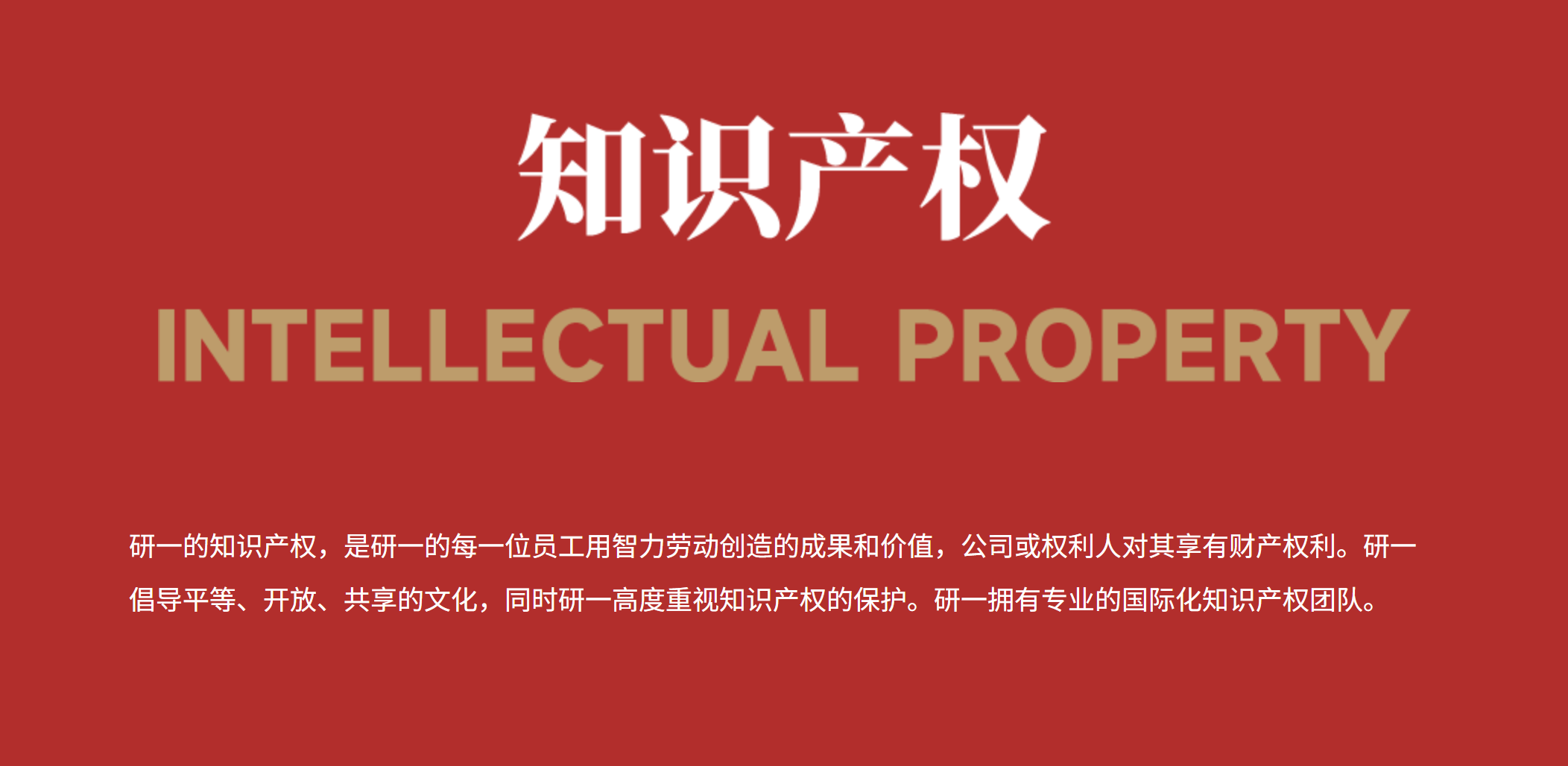 “研一的知识产权,是研一的每一位员工用智力劳动创造的成果和价值,公司或权利人对其享有财产权利。研一倡导平等、开放、共享的文化,同时研一高度重视知识产权的保护。研一拥有专业的国际化知识产权团队。”
