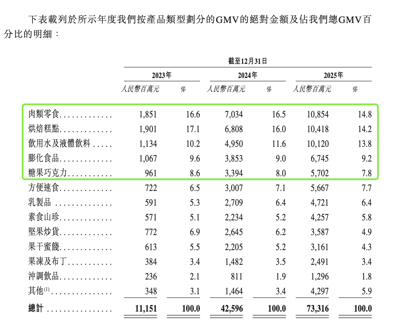 此次万辰更新的招股书也显示,肉类零食、烘焙糕点、饮用水及液体饮料、膨化食品、糖果巧克力五大品类,在过去3年的GMV金额中,占比均超过50%。