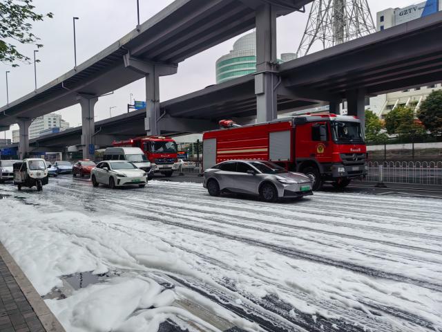 据南方 +,记者 12 时 35 分赶赴现场时发现,现场 3 台灭火器已准备收尾作业,道路两侧留存有灭火后的白色泡沫,民警正在现场维持秩序,清洁人员同步对路面进行清理。