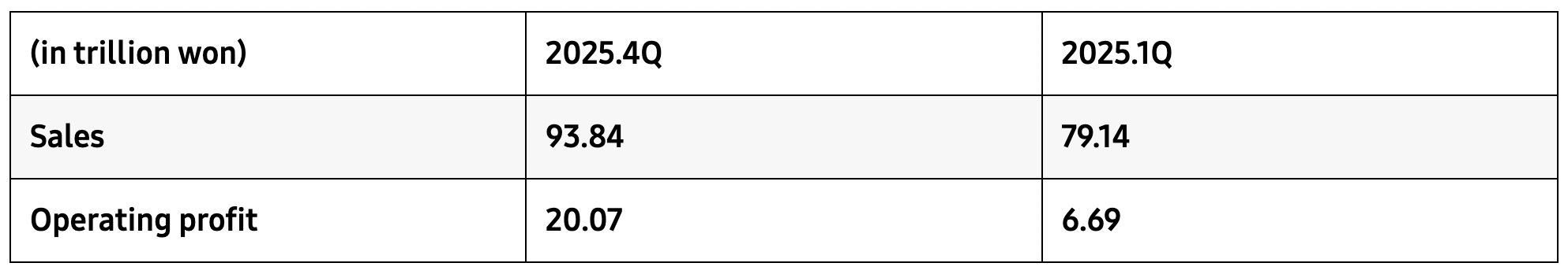 三星电子2025年四季度及2025年一季度合并财务数据   图片来源:三星电子