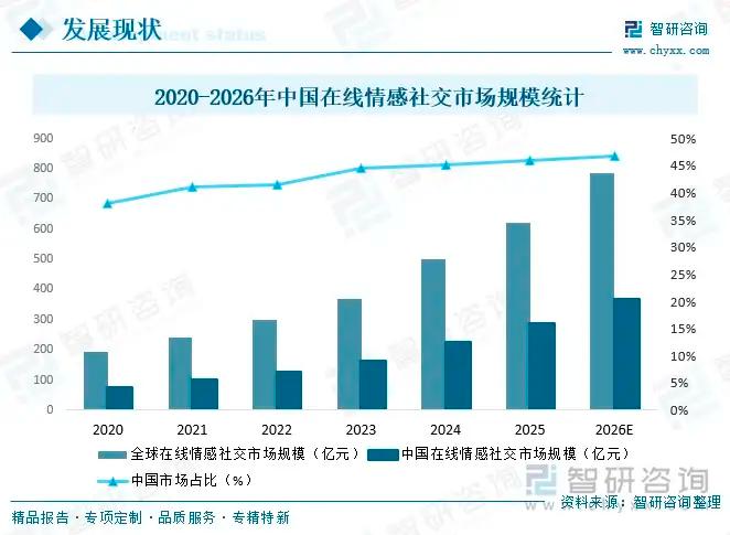 这种 " 可能性 ",构成了付费的心理基础,市场也因此迅速扩大。智研咨询显示,2025 年我国在线情感社交市场规模达 285 亿元,同比增长 26.1%,占全球在线情感社交市场整体规模的 45.9%。