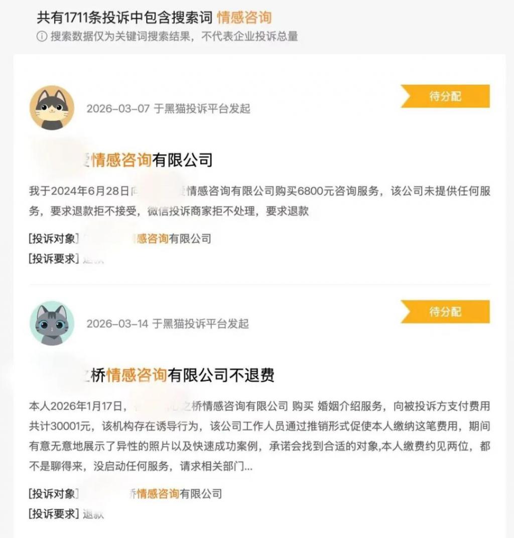黑猫投诉平台上," 情感咨询 " 相关的投诉已累计超过 1700 条