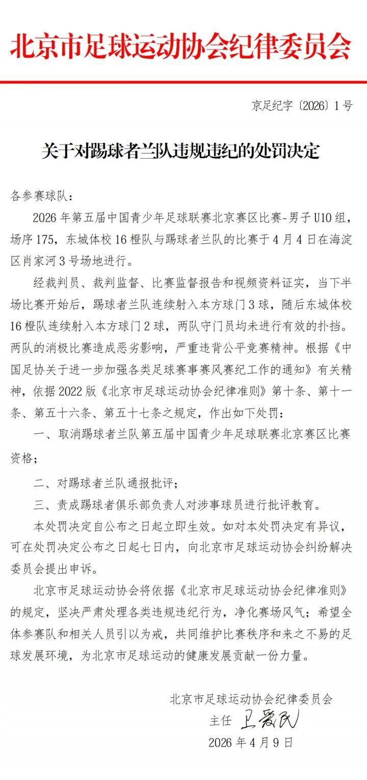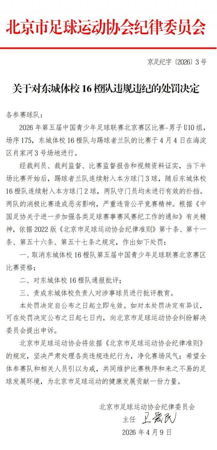 北京时间 4 月 9 日,北京足协连发四条处罚决定,对中青赛北京赛区 U10 组东城体校 16 橙队和踢球者兰队在比赛中互射本方球门的行为处以取消赛事资格,两队领队及主教练均被禁赛一年。
