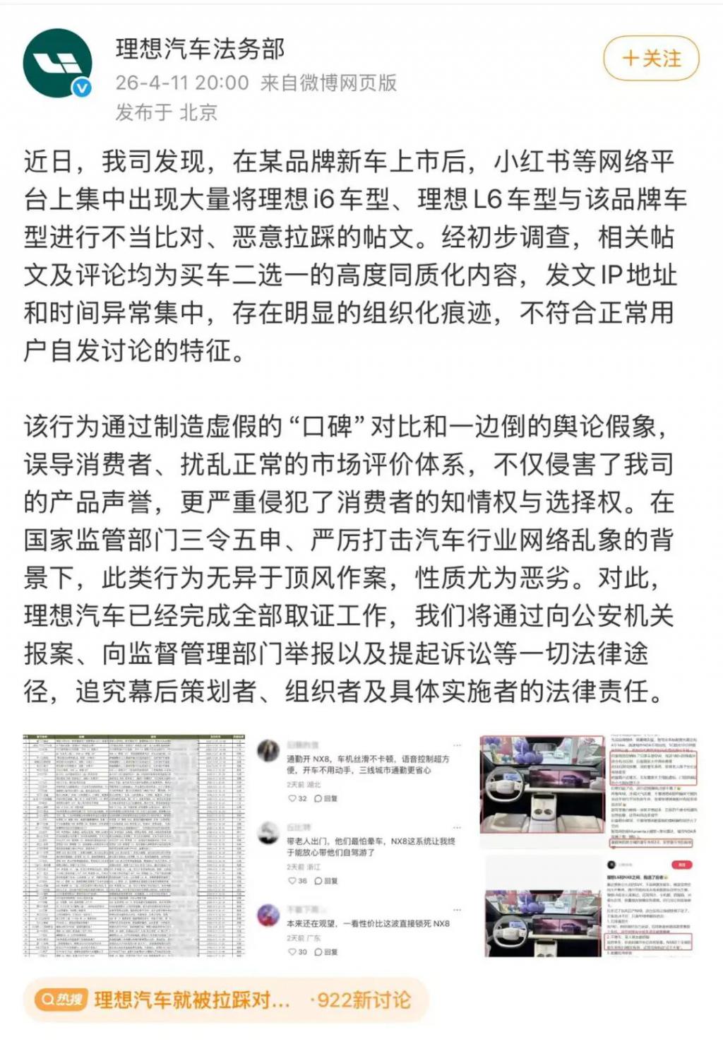 11 日晚,理想法务部官微发布声明称,近日,公司发现,在某品牌新车上市后,小红书等网络平台上集中出现大量将理想 i6 车型、理想 L6 车型与该品牌车型进行不当比对、恶意拉踩的帖文。经初步调查,相关帖文及评论均为买车二选一的高度同质化内容,发文 IP 地址和时间异常集中,存在明显的组织化痕迹,不符合正常用户自发讨论的特征。