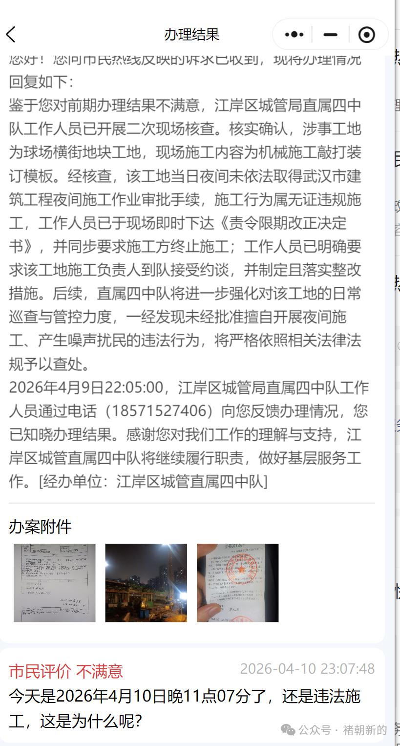 这件事里,有个细节很值得大家注意:相先生及小区其他业主一旦发现工地深夜施工扰民,就会向武汉 12345 投诉求助,每次都有回应,但深夜扰民的噪音就是停不下来。
