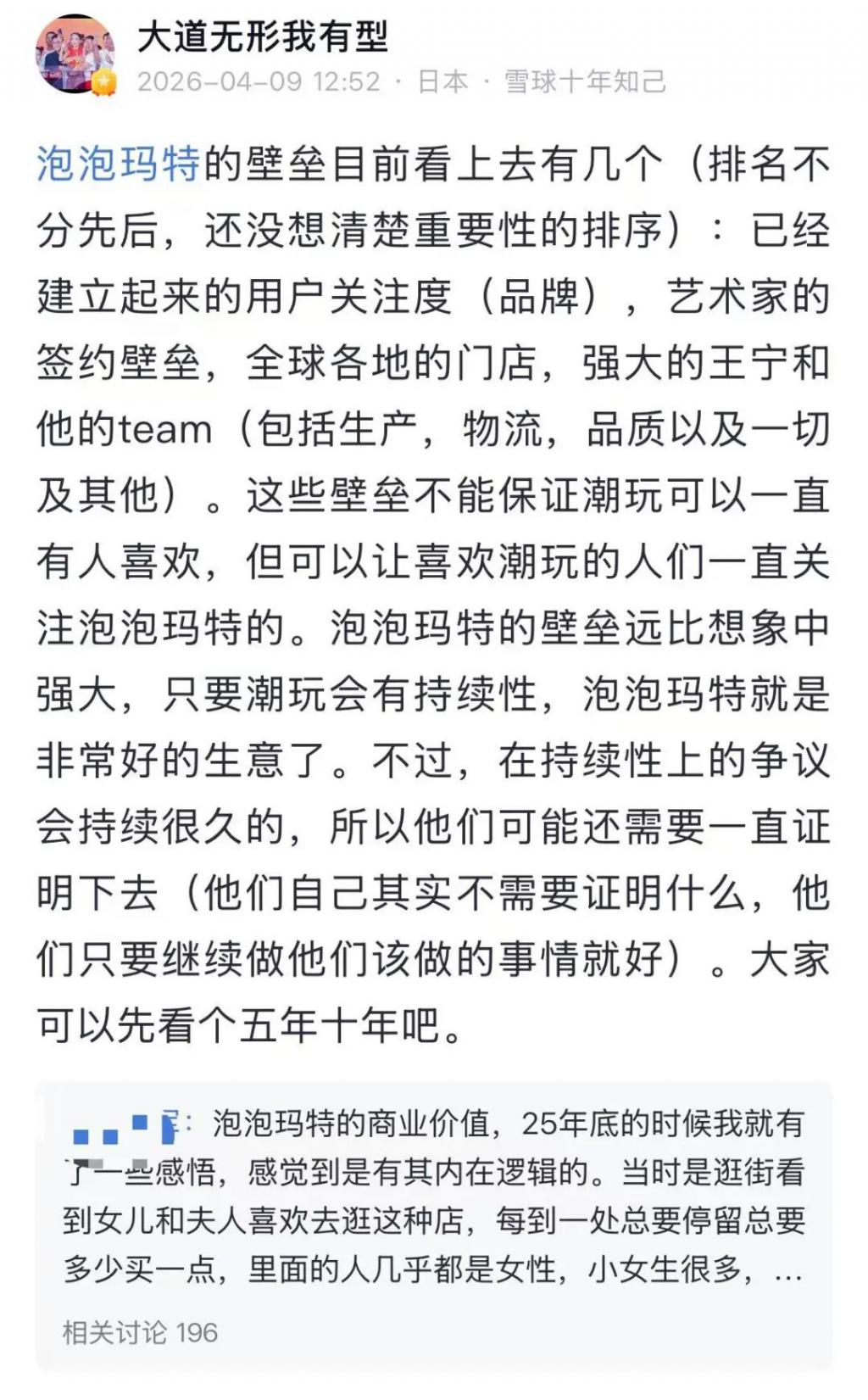 4 月 9 日,段永平还发文表示:泡泡玛特的壁垒目前看上去有几个(排名不分先后,还没想清楚重要性的排序):已经建立起来的用户关注度(品牌),艺术家的签约壁垒,全球各地的门店,强大的王宁和他的 team(包括生产,物流,品质以及一切及其他)。这些壁垒不能保证潮玩可以一直有人喜欢,但可以让喜欢潮玩的人们一直关注泡泡玛特的。泡泡玛特的壁垒远比想象中强大,只要潮玩会有持续性,泡泡玛特就是非常好的生意了。不过,在持续性上的争议会持续很久的,所以他们可能还需要一直证明下去(他们自己其实不需要证明什么,他们只要继续做他们该做的事情就好)。大家可以先看个五年十年吧。