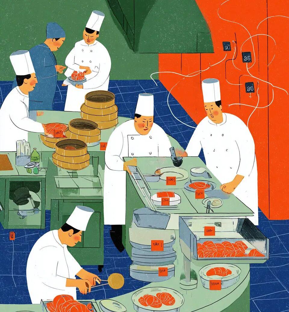 我还记得临近春节的时候,后厨的三个大蒸箱,每个都有三四层,被塞得满满当当。眼看着有个订单倒计时只剩 30 秒了、要赶紧打上卡,往往越着急越容易出事,海鲜拿出来了,但用来打卡的芯片掉在蒸箱里了。防烫手套不灵活,而且根本来不及戴,组长就直接戴着薄薄的一次性手套伸进滚烫的蒸箱里捞芯片——这么拼命,是因为会影响绩效考核。