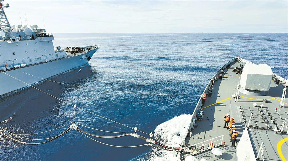 太湖舰为唐山舰进行横向补给。图片来源:解放军报 杜江帆 摄(资料图)
