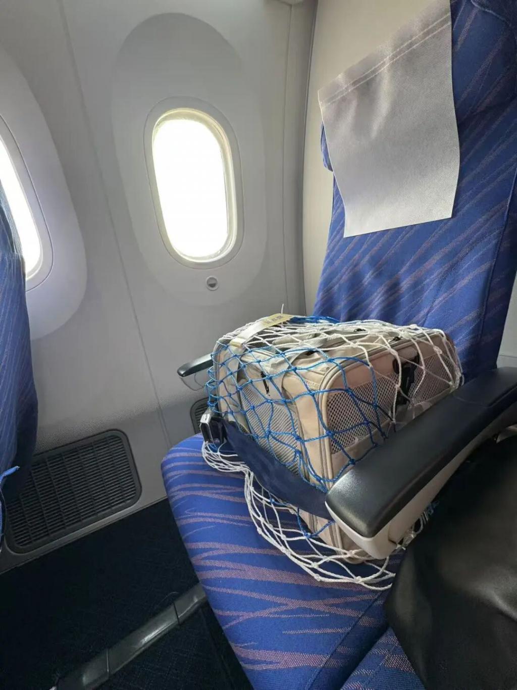 过完安检,啤啤被重新放回软包,拉链被扎带封死,外面再套上一层蓝白色网兜。从这一刻开始,到落地之前,箱子都不能再打开。按照规定,Lexi 和啤啤被安排在客舱最后一排。啤啤缩成一团,轻微发抖,没有进食,也没有发出太多声音。