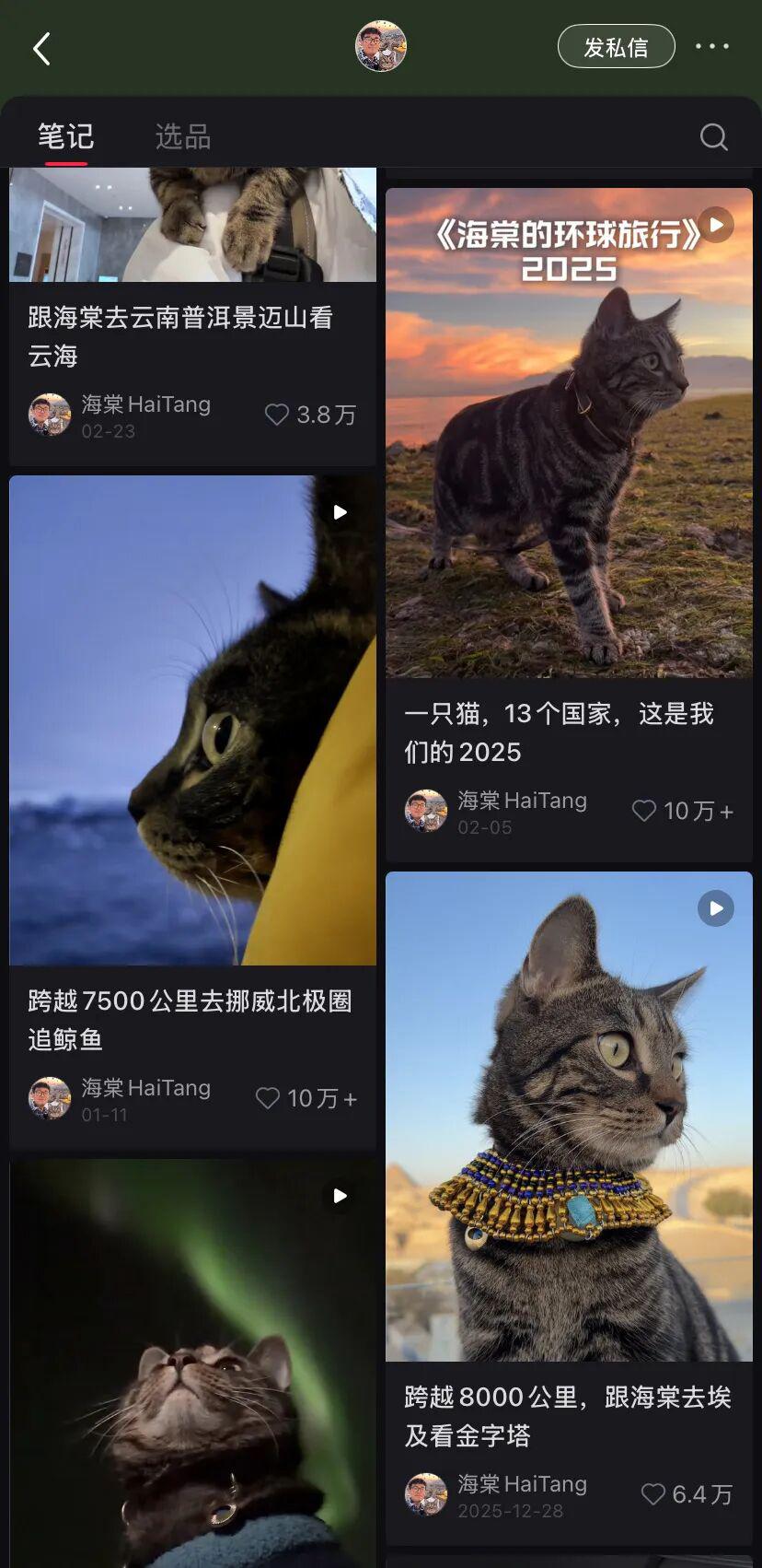 最让人羡慕的携宠出行,当属 @海棠 HaiTang。博主带着小猫海棠出入商务舱,在广西涠洲岛的游船、内蒙古的草原都撒过野,足迹远至土耳其和北欧,仅去年一年就周游过 13 个国家。
