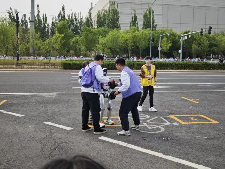 宇树一共派出 3 个队伍,全为自主导航,使用的是微调过的 2023 年老机型 H1。机器人在终点附近失控摔倒,被担架抬走,最终未能完赛。