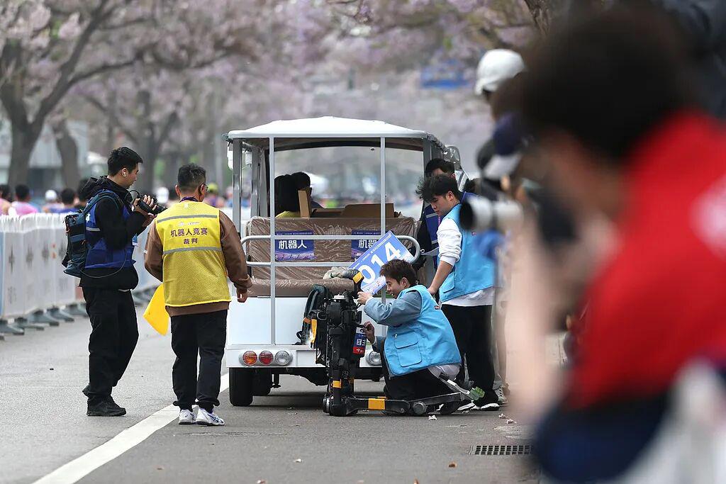 4 月 19 日早上七点半,第一台机器人从起点鸣枪开跑,将竞争对手远远甩在了身后。在距离终点仅 100 米的最后一个弯道处,这台机器人撞上护栏摔倒。