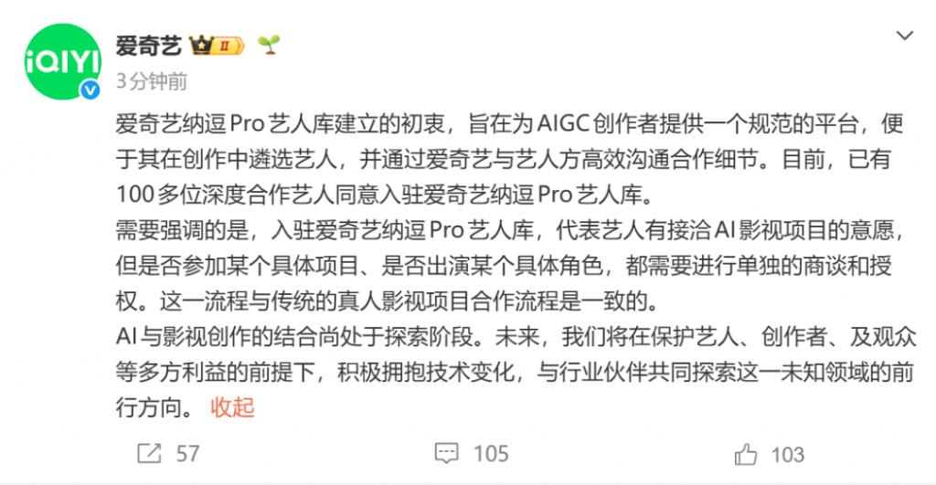 需要强调的是,入驻爱奇艺纳逗 Pro 艺人库,代表艺人有接洽 AI 影视项目的意愿,但是否参加某个具体项目、是否出演某个具体角色,都需要进行单独的商谈和授权。这一流程与传统的真人影视项目合作流程是一致的。
