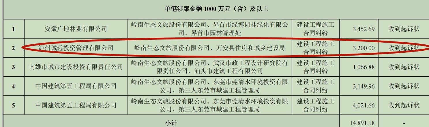 天眼查APP显示,泸州诚远成立于2013年,注册资本仅1000万元。这家位于四川泸州的小微企业,于2025年10月以“建设工程施工合同纠纷”为由,将ST岭南和万安县住建局一同告上法庭,涉案金额3200万元。