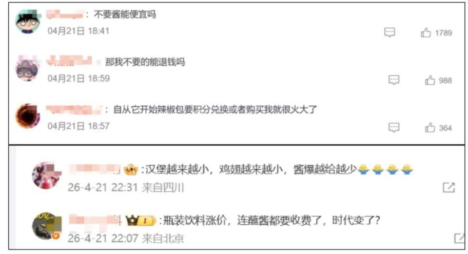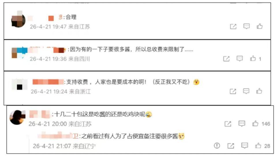 此外,收费后的蘸酱规格较此前有所提升。以甜辣酱为例,过去普通包装为 20 克,目前收费包装为 30 克,容量有所增加。