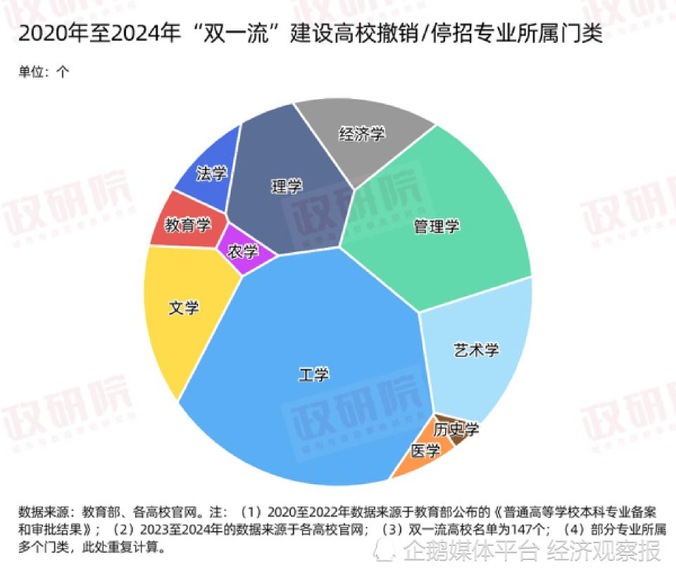 经济观察报对国内 147 所 " 双一流 " 建设高校 2020 年至 2024 年的专业停招与撤销情况进行了统计。其中,2020 年至 2022 年的数据来自教育部公布的《普通高等学校本科专业备案和审批结果》,2023 年至 2024 年的数据来自各高校官网。由于部分专业可授予多个门类学位,如电子商务可同时授予工学、管理学或经济学学位,因此统计中对此类情况进行了重复计算。