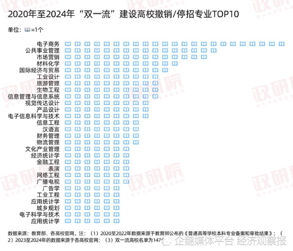 具体到专业,电子商务是近 5 年 " 双一流 " 建设高校中撤销或停招最多的专业,且力度逐年加大。仅 2024 年一年,就有包括西北工业大学、四川大学在内的 9 所 " 双一流 " 建设高校停招该专业。