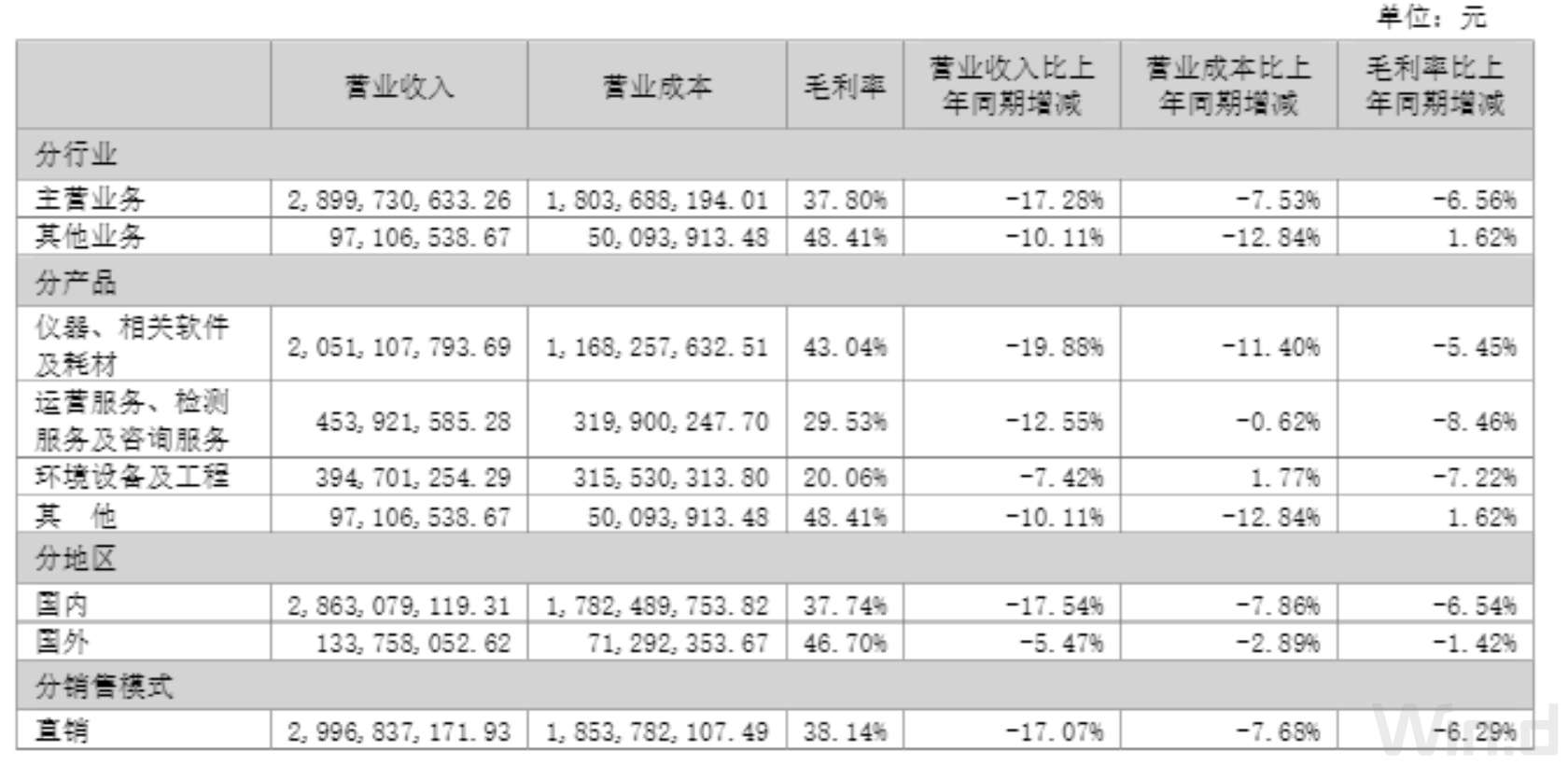 聚光科技盈利能力的下滑同样不容忽视。去年公司主营业务毛利率为37.80%,同比下降6.56个百分点。分产品看,核心仪器产品毛利率43.04%,同比下降5.45个百分点;运营服务毛利率29.53%,同比下降8.46个百分点;环境设备及工程业务毛利率20.06%,同比下降7.22个百分点。全产品线毛利率同步下滑,反映出行业竞争的白热化,国产与外资品牌的价格战愈演愈烈,聚光科技既面临本土品牌的低价冲击,也遭遇外资品牌降价抢占市场的压力,提价空间被挤压,成本端的压力无法通过售价转移,最终只能由利润承担。