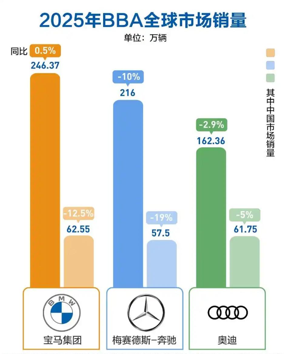 据统计,2025 年,BBA 在中国市场的纯电车型总销量不足 30 万辆,而同期蔚来、理想、小米和特斯拉等新品牌的单一品牌销量动辄突破 20 万辆,差距一目了然。