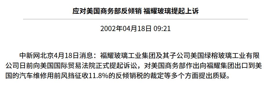 先把时间轴拉回到上世纪 90 年代,福耀作为中国最大的汽车玻璃制造商,正式进入美国市场,可美国那边动不动就挥舞 " 反倾销 " 的大棒,恶意加税,2002 年,美国商务部初裁福耀倾销成立,征收 11.8% 的临时反倾销税。