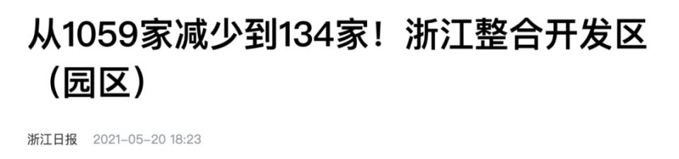 浙江的行动更早,动作也更大。早在 2021 年,就将全省开发区(园区)由 1059 家减少到 134 家,缩减幅度超过 80%。