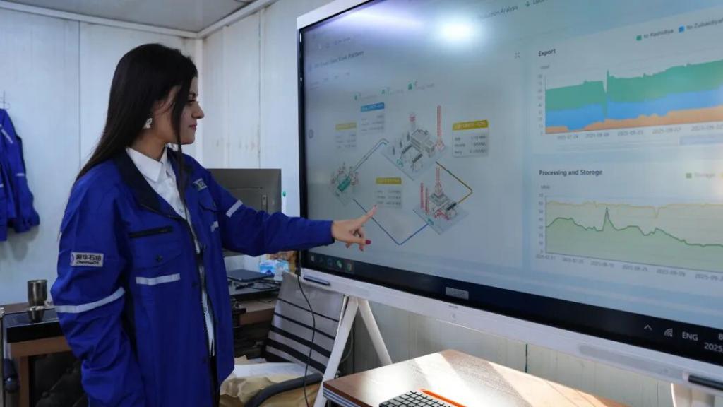 ◎ 10 月 12 日,首批振华石油奖学金项目留学生阿娅 · 伊马德在伊拉克东巴油田数智油田部工作|图源:新华社记者段敏夫 摄