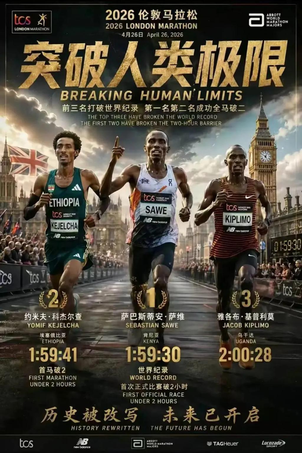 1. 2026 年伦敦马拉松成为人类耐力史上的分水岭:肯尼亚选手萨维以 1 小时 59 分 30 秒夺冠,成为正式比赛中首位跑进 2 小时的人,前三名全部突破原世界纪录。
